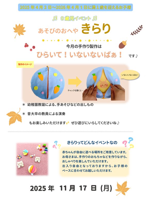 音楽幼稚園 0歳児あそびのおへや『きらり』ひらいて!いないいないばぁ(南部)