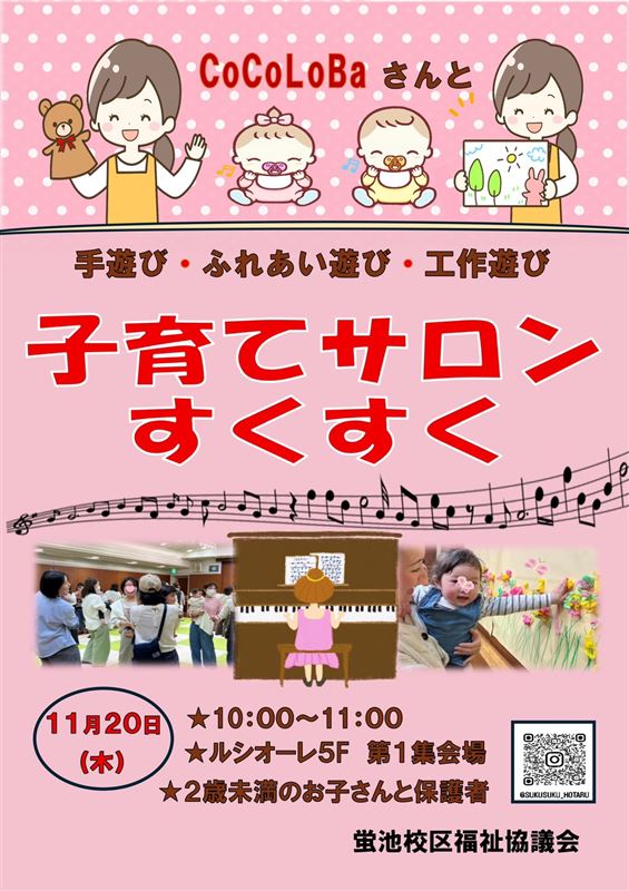 あかちゃんと保護者のふれあい遊びや演奏会など、毎月楽しい企画をご用意しています。保護者の方のお友達作りの場にもなれたらと考えています。