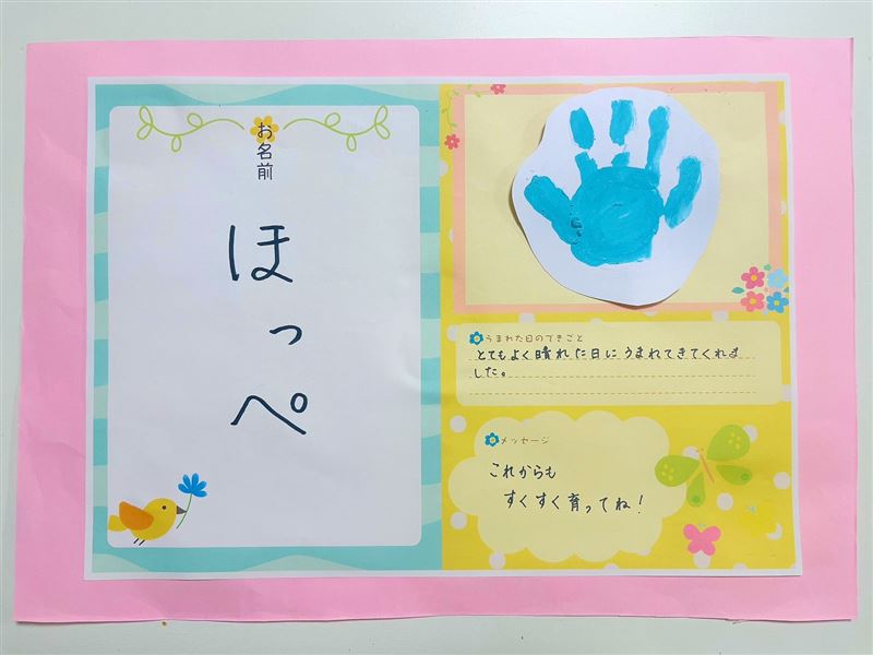 おこさまの大切なお名前・うまれた日の出来事などの思い出やメッセージを、手形アートと一緒に残しましょう★