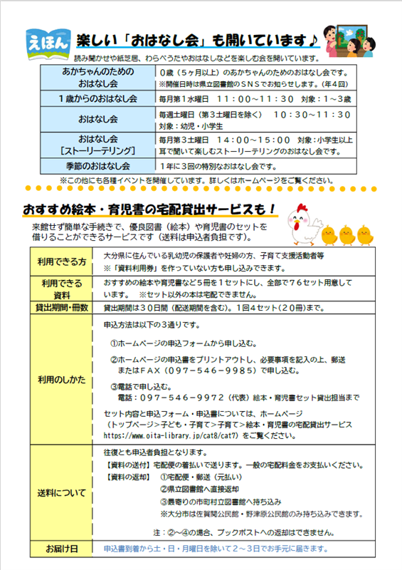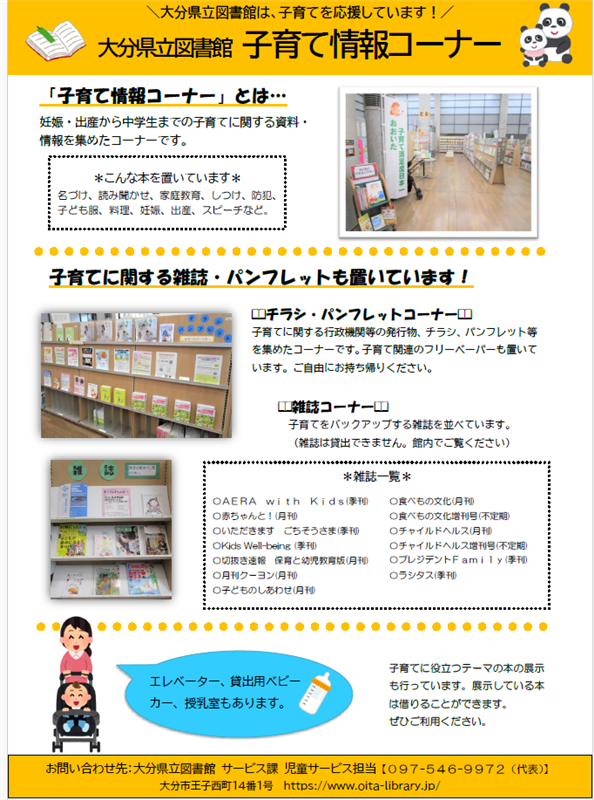 大分県立図書館には、子育てが楽しくなる本や、子育ての困りごとを解決する本を集めた「子育て情報コーナー」があります。妊娠出産から中学生までの子育てに関する本やチラシ・パンフレットなどを集めています。この他にも、おはなし会やアニメ映画上映会など、子どもと一緒に家族で楽しめるイベントも、たくさん行っています!詳しくは当館ホームページをご覧ください。