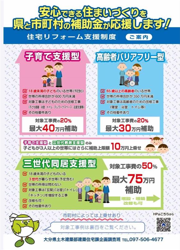 詳細については、お住まいの市町村の申請窓口、または大分県建築住宅課企画調査班(TEL:097-506-4677)までお問い合わせください。