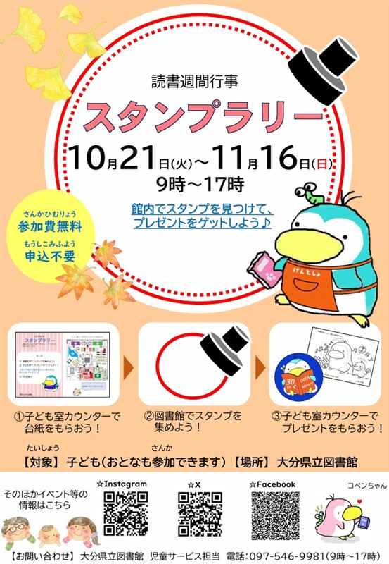 県立図書館では、読書週間にあわせて館内でスタンプラリーを開催します。ぜひ、みんなで挑戦してください!期間:10月21日(火曜日)から11月16日(日曜日)まで受付時間:9時から17時場所:大分県立図書館台紙配布場所:子ども室カウンター対象:子ども向け(おとなも参加できます)参加費:無料申込:不要
