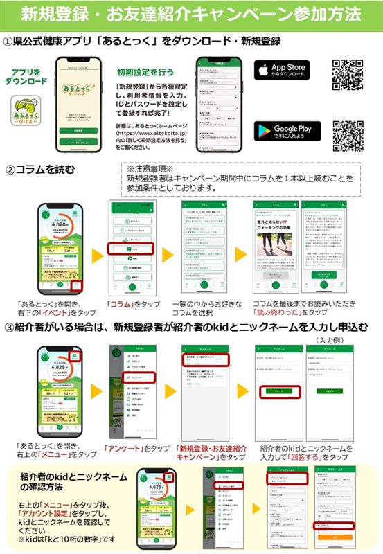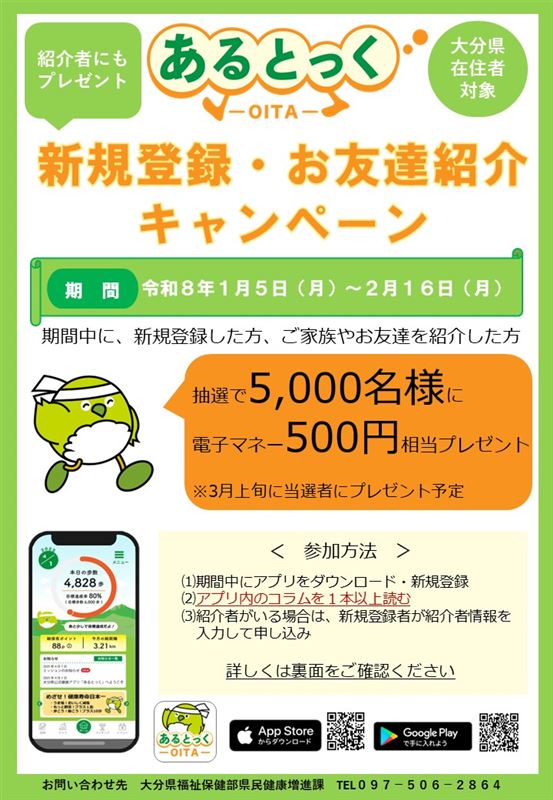 大分県公式健康アプリ「あるとっく」では、 新規登録・お友達紹介キャンペーンを実施中です!